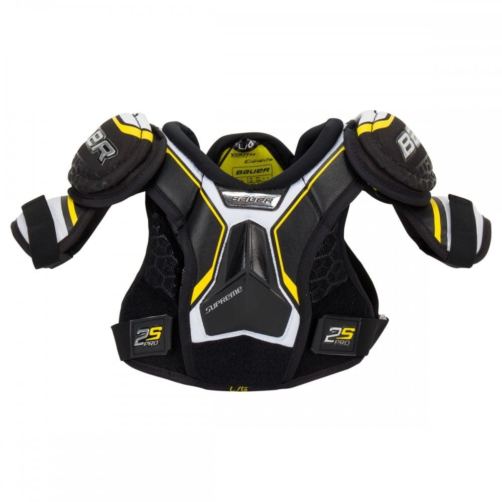 Нагрудник BAUER SUPREME 2S PRO S19 YTH детская модель сезона 2019 года имеет удобную, анатомическую посадку с близко расположенными к телу элементами защиты. Нагрудник обладает отличной подвижностью, легкостью и обеспечивает высокий уровень защиты. Использование вентилируемой пены Vent Armor в передней панели значительно снижает вес нагрудника, обеспечивает надежную защиту и отличную вентиляцию. Закрывающий грудину, центральный щиток выполнен из композита Curv. Защищающий позвоночник, центральный щиток производится из формованной пены средней плотности. Дополнительная вкладка из пластика усиливает защиту. Боковые части задней панели выполнены из пены средней плотности. Область ключиц защищена арочными элементами, которые выполнены из пены высокой плотности, имеют расширенную конструкцию и обеспечивают максимальное покрытие. Односоставные элементы защиты бицепса выполнены с применением формованного пластика.