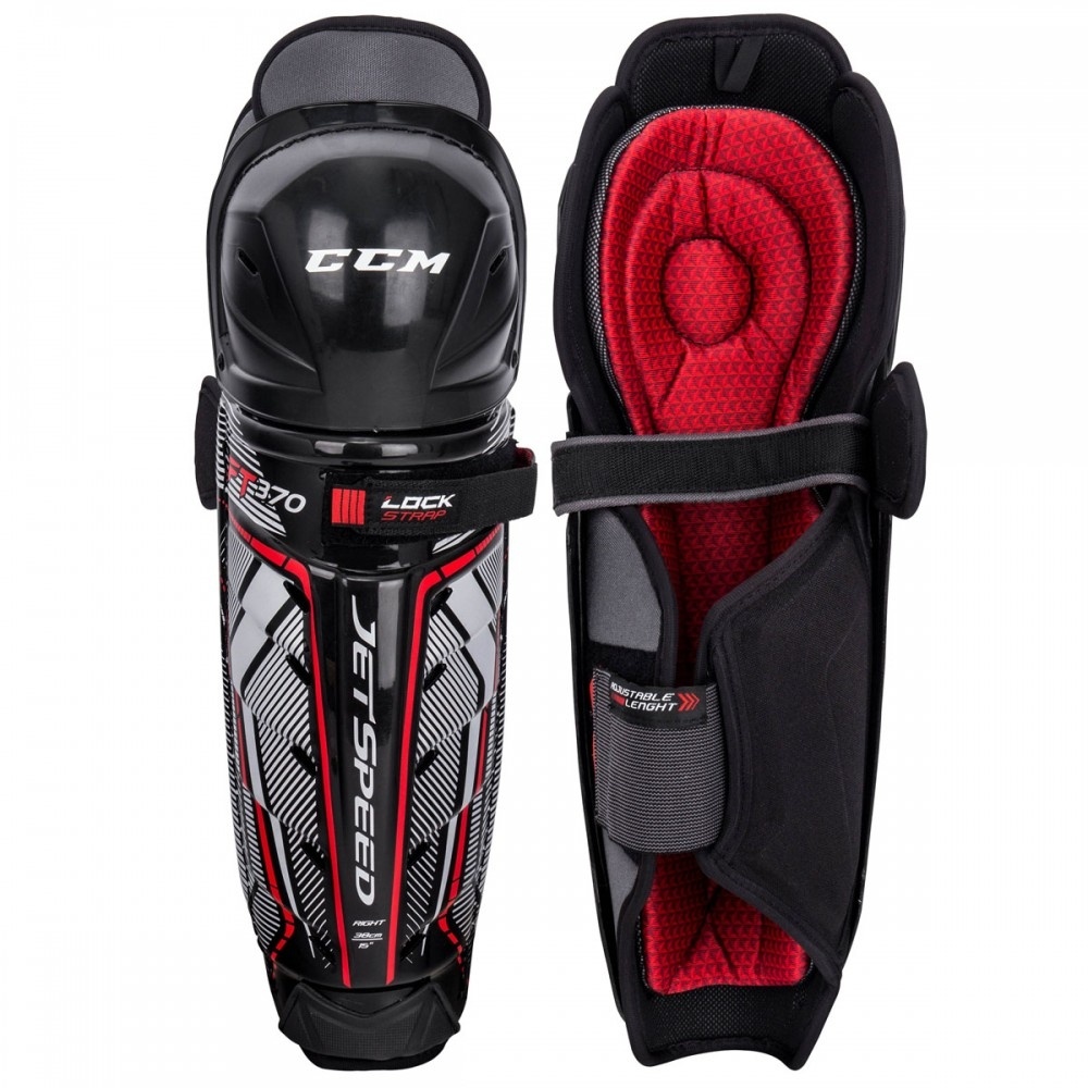 Щитки хоккейные полевого игрока CCM JETSPEED FT370 SR модель полупрофессионального уровня. Анатомическая форма корпуса колени и коленной чаши обеспечивает более плотное прилегание защиты к телу и более низкий профиль элементов защиты. Коленная чаша и защита голени соединены по бокам шарнирной конструкцией, которая обеспечивает хорошую подвижность и исключает разрывы в защите между коленом и голенью. Вентилируемая, фронтальная часть корпуса способствует созданию прямого воздушного потока, который проходит через щиток при движении игрока. При изготовлении корпуса используется формованный, жесткий пластик, который благодаря своей ребристой конструкции создает высококачественную защиту, в то время как пена средней плотности, покрывающая корпус с внутренней стороны, хорошо поглощает силу удара, защищая и обеспечивая комфорт.